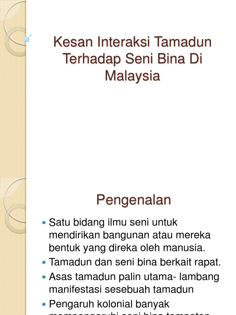 Kedatangan Islam ke Tanah Melayu seawal kurun ke-7H. Tamadun cina pengaruh implikasi tamadun cina dalam kehidupan masyarakat tanah melayu nurliyana madihah natasha liyana sofea ashiqin TAMADUN CINA -. 40 PENGARUH BARAT DALAM SENI BINA DAN RAGAM HIAS MELAYU Selain dari pengaruh Hindu-Buddha dan Islam alam Melayu juga menerima pengaruh barat dalam aspek seni bina menerusi proses penjajahan yang dilakukan oleh mereka selama 500 tahun.