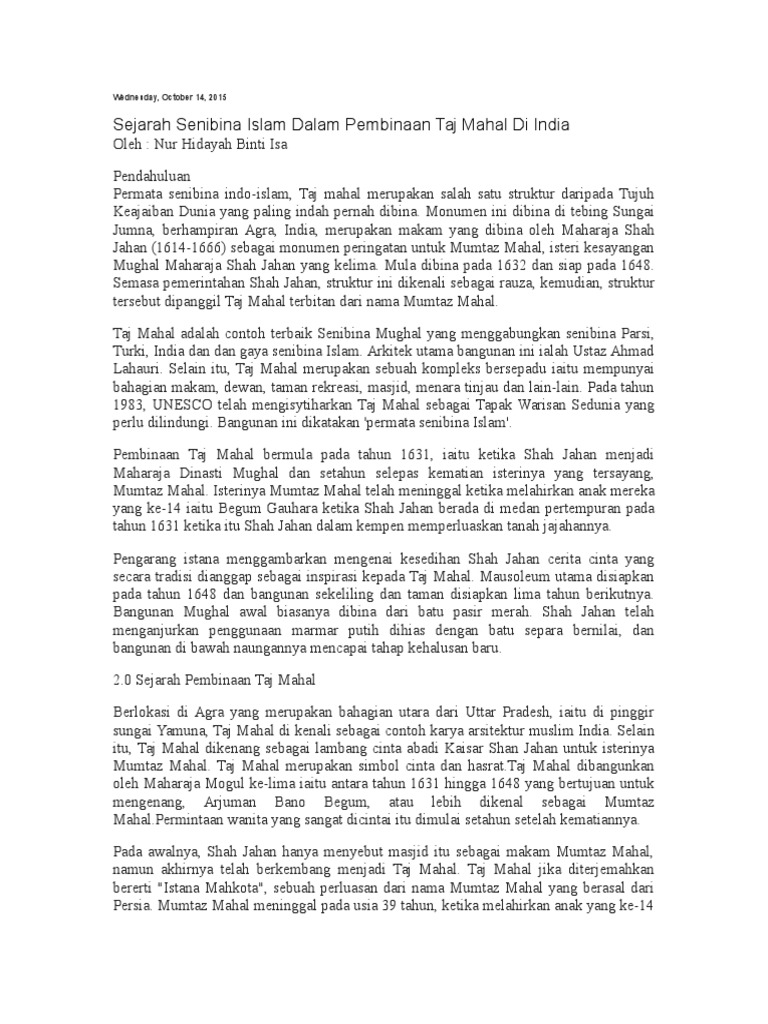 Kewujudan seni bina Islam telah berjaya menarik minat masyarakat dunia kerana keunikan seni bina itu tersendiri. SENI BINA TAJ MAHAL TAMADUN ISLAM DAN TAMADUN ASIA TITAS DEPARTMENTS Pada peringkat awal bangunan yang dibina oleh pemerintah Islam di India memperlihatkan bentuk seni bina Mesopotamia-Parsi Islam yang tulen.